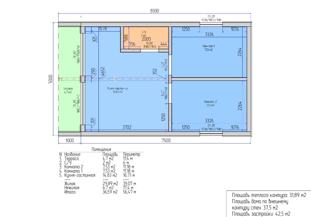 42,5 м²- общая площадь